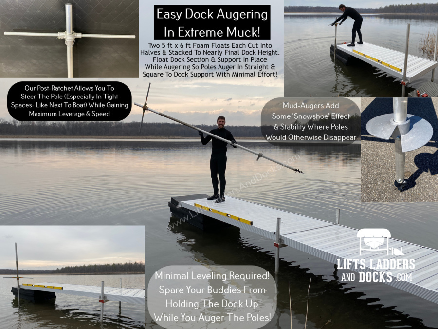 If you have a lot of augers to install or remove, then this is the tool you need! Even if you only have 2-6 augered poles for your boat tie-up, this is a lifesaver! Our ratchets have TWO HANDLES which makes a world of difference versus the one-handle versions that are on the market, allowing you to steer your post in as you ratchet, rather than tipping the pole at an angle like with a piece of re-bar or a one-handed ratchet. Also, we find that most people using re-bar, screw drivers or pipe wrenches never get the augers deep enough to be effective, and can be worse than a footplate in terms of stability when they are not driven deep enough- problem solved simply by having the right tool and increased leverage and effective angles of pressure downward as you ratchet.