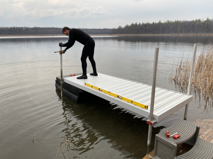 Save your buddies the hassle of holding up the dock while you auger using our foam floats (as seen above)! Cut a full-size float into halves or thirds and stack to the approximate desired installation height for a quick and easy installation!